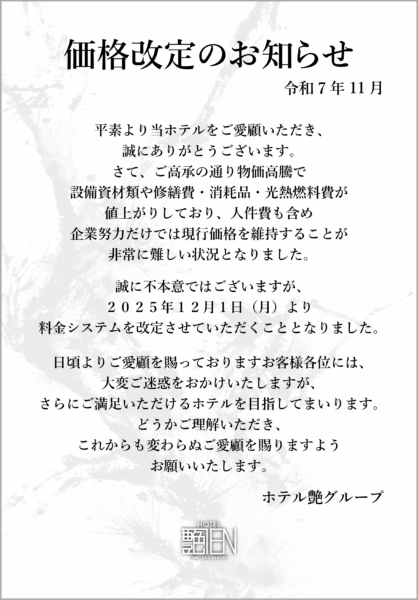 ※改定後の料金詳細は12/1以降の各店舗ホームページ[料金・お部屋・設備]よりご確認お願い致します